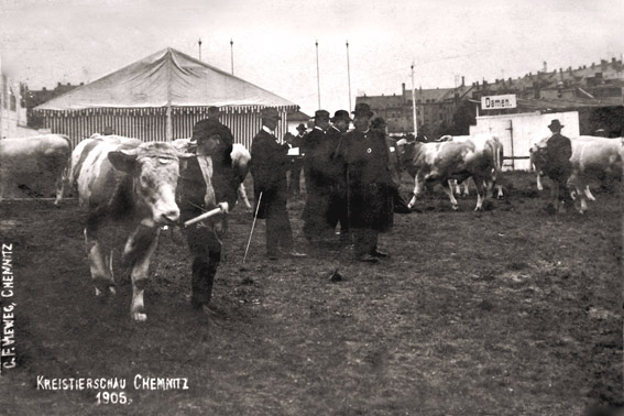 Im nordwestlichen Teil des Freigeländes Planitzwiese in Richtung Gellertstr. / Reinhardtstraße (die Zietenstraße endete damals an der Planitzstr.) wurde bereits im September 1905 eine Kreistierschau durchgeführt, bei der insbesondere das vorgeführte Großvieh allgemeines Interesse fand. |