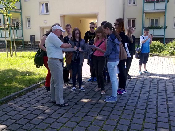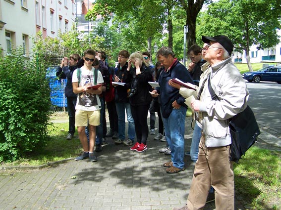 | So erkundete die eine Gruppe die Wohnanlage „Humboldthöhe“, die „Gölitz-Häuser“ und den „Wissmann-Hof“ als Teile ihrer Aufgabenstellung. Bei den Ausführungen zu den verschiedenen Wohnbauten wurden die Aspekte der Tradition und der Moderne genauso behandelt wie die sozialen Bezüge zu den genossenschaftlichen Bauten hergestellt. | ||