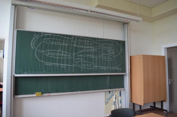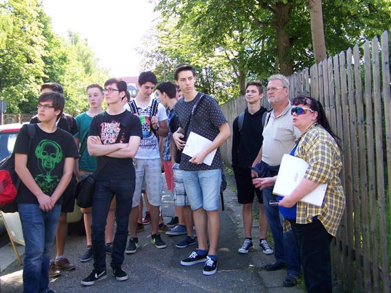 Am 5. und 6. Juni 2014 war es soweit, dass unsere Arbeitsgruppe mit interessierten Lehrern des Kepler-Gymnasiums einen gemeinsamen Projekttag für zwei Klassen 10 durchführen konnten. Dem ging eine rechtzeitige Kontaktaufnahme durch die Geografie-Lehrerin Frau Reuther voraus, so dass wir inhaltliche Schwerpunkte besser absprechen konnten. Hauptinhalt des Projekttages sollte sein, dass die Schüler wichtige Standortfaktoren für die Entwicklung der Industrie in Chemnitz (dargestellt am Stadtteil Sonnenberg) erkennen können und in der Lage sind, diese in einer Präsentation wiederzugeben. Nach Aufteilung in zwei Projektgruppen je Klasse zu den Themen: „Wohnungsbau in Tradition und Moderne“ und „Die industrielle Entwicklung“ wurden die spezifischen Bedingungen auf dem Sonnenberg bearbeitet. Ein Vortrag zur Gesamtsituation der Entstehung des Stadtteiles und seiner nachfolgenden Entwicklung bis in die Gegenwart bewirkte ein neues, komplexeres Verständnis zum Sonnenberg, zu mal nur sehr wenige Gymnasiasten aus dem Stadtteil selbst kommen und die meisten nur eine Straßenperspektive vom Bus oder Pkw her kennen. Angefangen von historischen Stadtplanbezügen und Fotos bis hin zu aktuellen Bildern vom Sonnenberg erstreckte sich der Vortrag und vieles wurde mitgeschrieben. Dem Vortrag folgte eine ca. 90minütige Exkursion durch den südöstlichen Sonnenberg, bei dem die spezifischen Aufgabenstellungen der Gruppen behandelt wurden. |