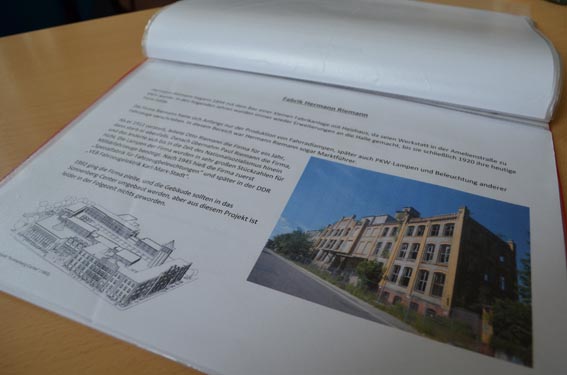 Die andere Gruppe hörte an der Fabrikruine der ehemaligen Firma „Hermann Riemann“ vieles zur interessanten Geschichte dieses Betriebes und bekam auch zum Funktionsprinzip einer Karbid-Fahrzeuglampe eine anschauliche Vorführung, weil ein Anschauungsexemplar mitgebracht wurde. Weiterhin spielte die ehemalige Großwäscherei an der Fürstenstraße und die Ziegelherstellung auf dem Sonnenberg eine Rolle.