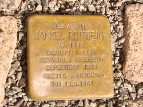 Der Stolperstein für Jankel Rotstein wurde am 7. Oktober 2008 vom Künstler Gunter Demnig in der Ludwig-Kirsch-Straße 1 (ehemals Alexanderstraße) verlegt. |