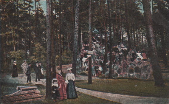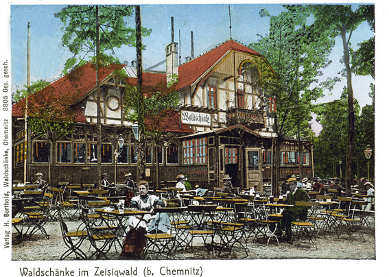 | Auch die 1899 errichtete Ausflugsgaststätte „Waldschänke“ mit ihrem großen Biergarten fügte sich in das Konzept des Waldparkes ein. | |||||
