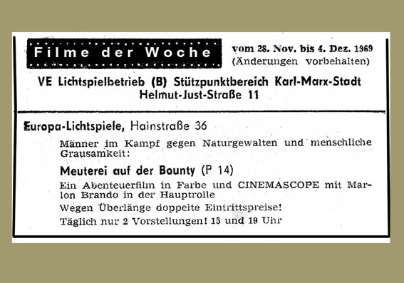 Damit endete im Jahr 1950 die Ära des „Sovexportfilm-Kinos“ auch im „Europa“ und „Welt-Echo“ – nun als volkseigene Lichtspielbetriebe mit der in der DDR neu gebildeten „PROGRESS-Filmverleih GmbH“ zur Seite. |